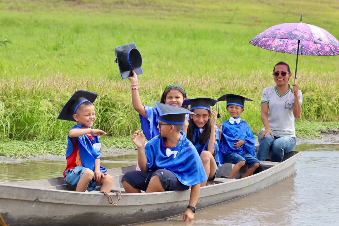 Vestidas com becas, elas posaram para as fotos, com a canoa como cenário – um meio de transporte essencial para chegar à escola, mas que, devido à estiagem, se tornou um desafio ainda maior. A jornada até a escola, antes feita por meio de rios caudalosos, agora exige um esforço extra das famílias e das crianças, que precisam percorrer longas distâncias por caminhos alternativos.